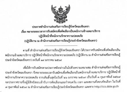 ประกาศสำนักงานส่งเสริมการเรียนรู้ประจำจังหวัดฉะเชิงเทรา เรื่อง ขยายระยะเวลาการรับสมัครเพื่อคัดเลือกเป็นพนักงานจ้างเหมาบริการ ปฏิบัติหน้าที่พนักงานรักษาความปลอดภัย (ปฏิบัติงาน ณ สำนักงานส่งเสริมการเรียนรู้ประจำจังหวัดฉะเชิงเทรา)