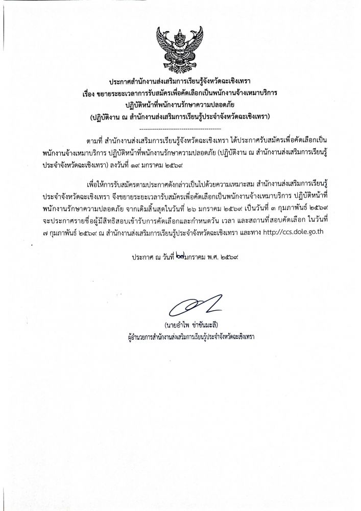 หมวดหมู่ : ข่าวประชาสัมพันธ์ หัวข้อเรื่อง : ประกาศสำนักงานส่งเสริมการเรียนรู้ประจำจังหวัดฉะเชิงเทรา เรื่อง ขยายระยะเวลาการรับสมัครเพื่อคัดเลือกเป็นพนักงานจ้างเหมาบริการ ปฏิบัติหน้าที่พนักงานรักษาความปลอดภัย (ปฏิบัติงาน ณ สำนักงานส่งเสริมการเรียนรู้ประจำจังหวัดฉะเชิงเทรา)