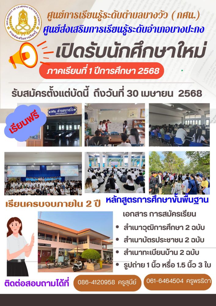 กศน.ตำบลบางวัว รับสมัครนักศึกษาใหม่ ภาคเรียนที่ 1 ปีการศึกษา 2565