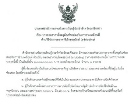 ประกาศสำนักงานส่งเสริมการเรียนรู้ประจำจังหวัดฉะเชิงเทรา เรื่อง ประกวดราคาซื้อครุภัณฑ์รถส่งเสริมการการอ่านเคลื่อนที่ด้วยวิธีประกวดราคาอิเล็กทรอนิกส์ (e-bidding)