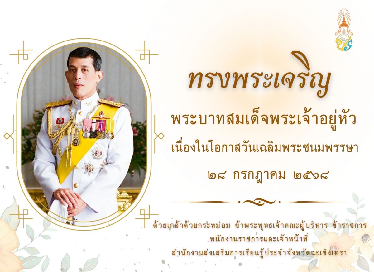 หมวดหมู่ : ข่าวประชาสัมพันธ์ หัวข้อเรื่อง : สำนักงานส่งเสริมการเรียนรู้ประจำจังหวัดฉะเชิงเทรา ขอเชิญชวนร่วมลงนามถวายพระพร พระบาทสมเด็จพระเจ้าอยู่หัว เนื่องในโอกาสวันเฉลิมพระชนมพรรษา ๒๘ กรกฎาคม ๒๕๖๘