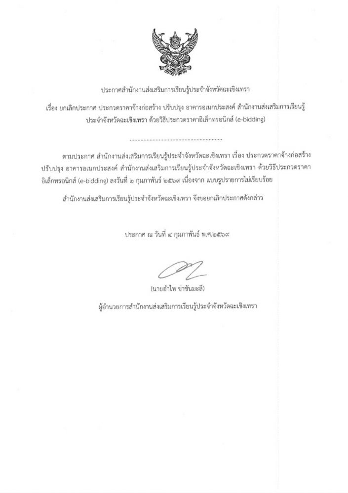 หมวดหมู่ : ข่าวประชาสัมพันธ์ หัวข้อเรื่อง : ยกเลิกประกาศ ประกวดราคาจ้างก่อสร้าง ปรับปรุง อาคารอเนกประสงค์ สำนักงานส่งเสริมการเรียนรู้ประจำจังหวัดฉะเชิงเทรา ด้วยวิธีประกาศราคาอิเบ็กทรอนิกส์ (e-bidding)