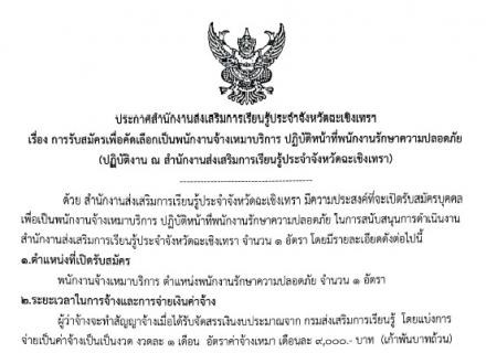 ประกาศสำนักงานส่งเสริมการเรียนรู้ประจำจังหวัดฉะเชิงเทรา เรื่อง การรับสมัครเพื่อคัดเลือกเป็นพนักงานจ้างเหมาบริการ ปฏิบัติหน้าที่พนักงานรักษาความปลอดภัย (ปฏิบัติงาน ณ สำนักงานส่งเสริมการเรียนรู้ประจำจังหวัดฉะเชิงเทรา)