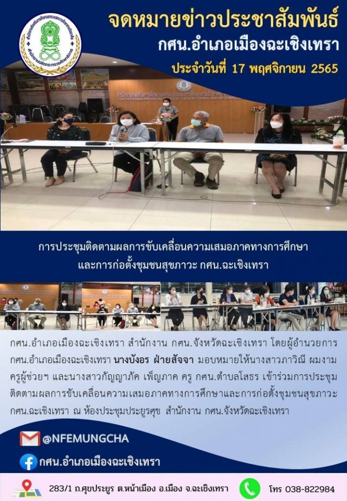 วันที่ 17 พฤศจิกายน 2565 กศน.อำเภอเมืองฉะเชิงเทรา สำนักงาน กศน.จังหวัดฉะเชิงเทรา โดยผู้อำนวยการ กศน.อำเภอเมืองฉะเชิงเทรา นางบังอร ฝ่ายสัจจา มอบหมายให้นางสาวภาวิณี ผมงาม ครูผู้ช่วยฯ และนางสาวกัญญาภัค เพ็ญภาค ครู กศน.ตำบลโสธร เข้าร่วมการประชุมติดตามผลการขับเคลื่อนความเสมอภาคทางการศึกษาและการก่อตั้งชุมชนสุขภาวะ กศน.ฉะเชิงเทรา โดยมีนางสาวอุไรรัตน์ ชนะบำรุง รองผู้อำนวยการ สำนักงาน กศน.จังหวัดฉะเชิงเทรา รักษาการในตำแหน่ง ผู้อำนวยการสำนักงาน กศน.จังหวัดฉะเชิงเทรา เป็นประธานเปิดการประชุม ร่วมกับมูลนิธิเพื่อสังคม โดยมีพล.ต.ต.ดร.โกสินทร์ หินเธาว์ อดีตรองผู้บัญชาการตำรวจสอบสวนกลาง และ ดร.ปนัดดา ชำนาญสุข ร่วมเป็นวิทยากรติดตามการขับเคลื่อนความเสมอภาคทางการศึกษาและการก่อตั้งชุมชนสุขภาวะ สำนักงาน กศน.ฉะเชิงเทรา เพื่อประเมินและพัฒนาองค์ความรู้ว่าด้วยความซับซ้อนของปัญหาความไม่เสมอภาคของเด็กนอกระบบพัฒนาศักยภาพกำลังคนที่รับผิดชอบหรือเกี่ยวข้องกับการศึกษาสำหรับเด็กนอกระบบ พัฒนารูปแบบ/กลไกเชิงระบบในการส่งเสริมความเสมอภาคทางการศึกษาให้กับเด็กนอกระบบ และพัฒนาข้อเสนอแนะเชิงนโยบายสำหรับการขับเคลื่อนทั้งในระดับชาติและพื้นที่หรือบริบทเฉพาะ ณ ห้องประชุมประยูรศุข สำนักงาน กศน.จังหวัดฉะเชิงเทรา