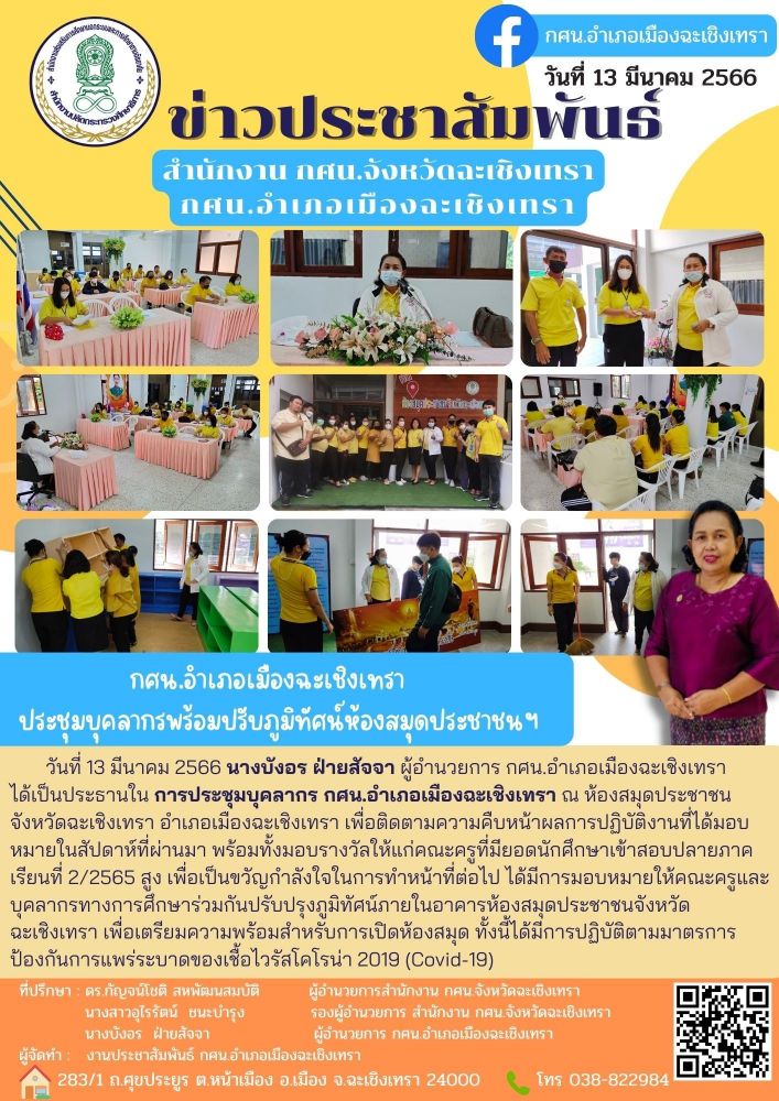ได้เป็นประธานใน การประชุมบุคลากร กศน.อำเภอเมืองฉะเชิงเทรา ณ ห้องสมุดประชาชนจังหวัดฉะเชิงเทรา อำเภอเมืองฉะเชิงเทรา เพื่อติดตามความคืบหน้าผลการปฏิบัติงานที่ได้มอบหมายในสัปดาห์ที่ผ่านมาพร้อมทั้งมอบรางวัลให้แก่คณะครูที่มียอดนักศึกษาเข้าสอบปลายภาคเรียนที่ 2/2565 สูง เพื่อเป็นขวัญกำลังใจในการทำหน้าที่ต่อไป ได้มีการมอบหมายให้คณะครูและบุคลากรทางการศึกษาร่วมกันปรับปรุงภูมิทัศน์ภายในอาคารห้องสมุดประชาชนจังหวัดฉะเชิงเทรา เพื่อเตรียมความพร้อมสำหรับการเปิดห้องสมุด ทั้งนี้ได้มีการปฏิบัติตามมาตรการป้องกันการแพร่ระบาดของเชื้อไวรัสโคโรน่า 2019 (Covid-19)