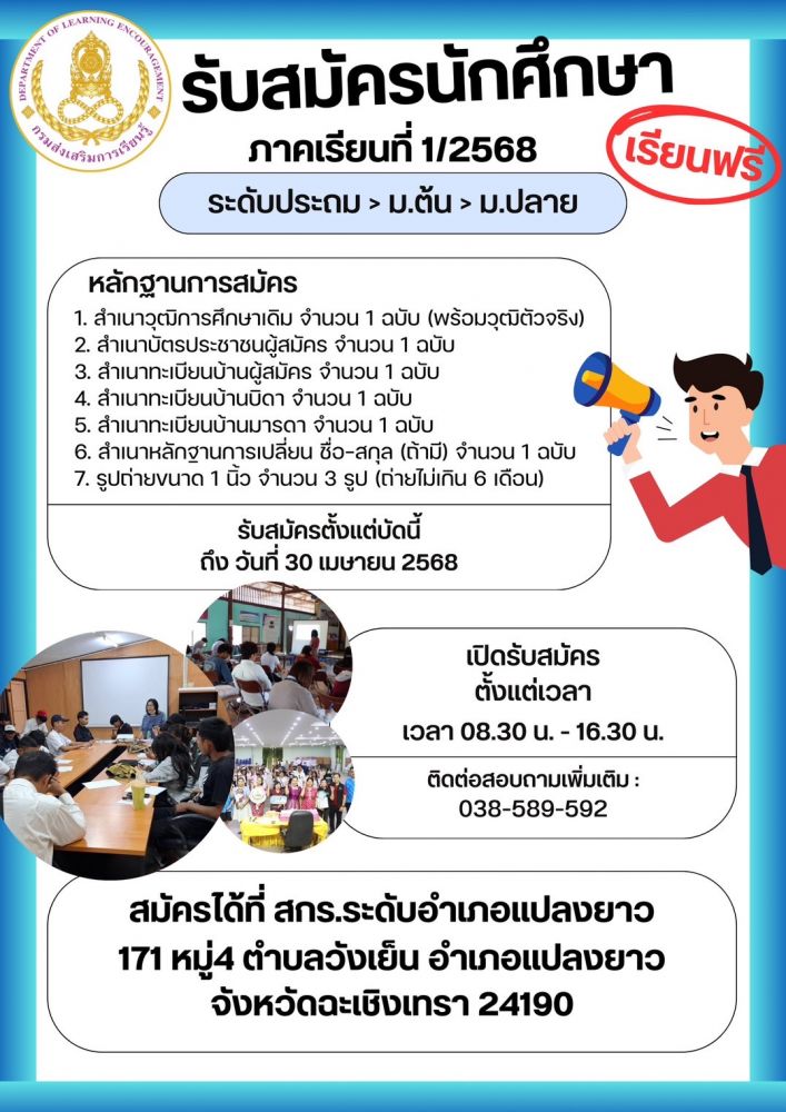 ขยายเวลา ถึง 15 พฤษภาคม 2567 ประกาศศูนย์ส่งเสริมการเรียนรู้อำเภอแปลงยาว เรื่อง รับสมัครบุคคลเพื่อคัดเลือกเป็นพนักงานจ้างเหมาบริการ ตำแหน่ง ครูผู้สอนคนพิการ
