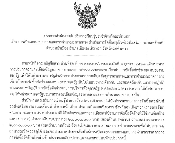 หมวดหมู่ : ข่าวประชาสัมพันธ์ หัวข้อเรื่อง : ประกาศสำนักงานส่งเสริมการเรียนรู้ประจำจังหวัดฉะเชิงเทรา เรื่อง การเปิดเผยราคากลางและการคำนวณราคากลาง สำหรับจัดซื้อครุภัณฑ์รถส่งเสริมการอ่านเคลื่อนที่