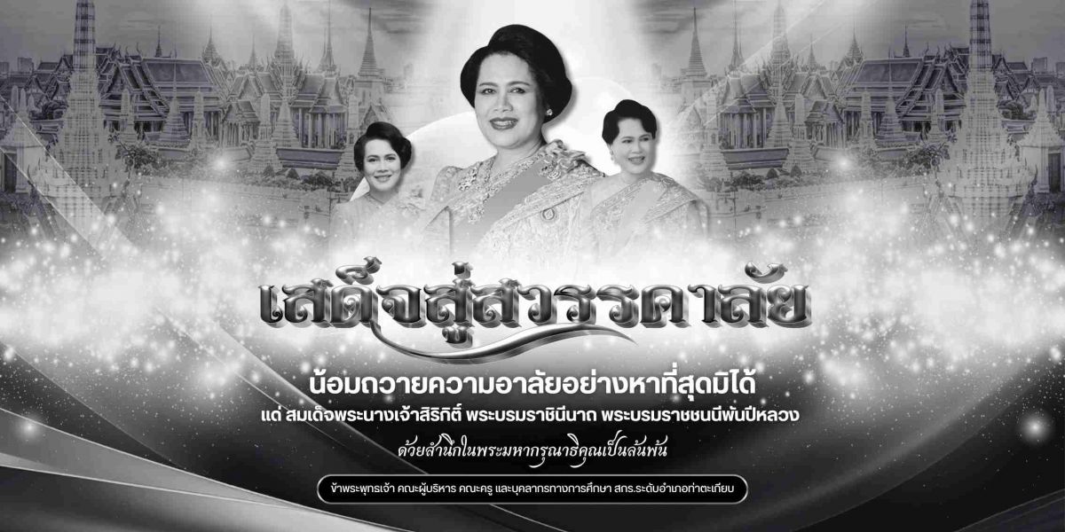 น้อมถวายความอาลัยอย่างหาที่สุดมิได้ แด่ สมเด็จพระนางเจ้าสิริกิติ์ พระบรมราชินีนาถ พระบรมราชชนนีพันปีหลวง ด้วยสำนึกในพระมหากรุณาธิคุณเป็นล้นพ้น ข้าพระพุทธเจ้า คณะผู้บริหาร คณะครู และบุคลากรทางการศึกษา สกร.ระดับอำเภอท่าตะเกียบ